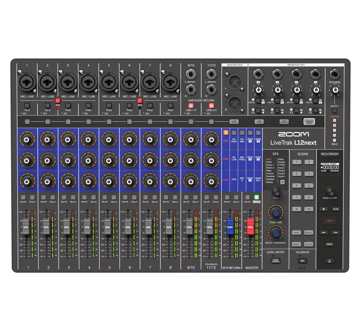 ZOOMが新たにリリースしたご注目のデジタルミキサー『LiveTrak L12next』は、アナログ機能とデジタルの操作性を見事に融合した製品です。これは特にライブサウンドの分野において、アーティストやエンジニアの日常業務を円滑に進めるための非常に便利なツールとなります。