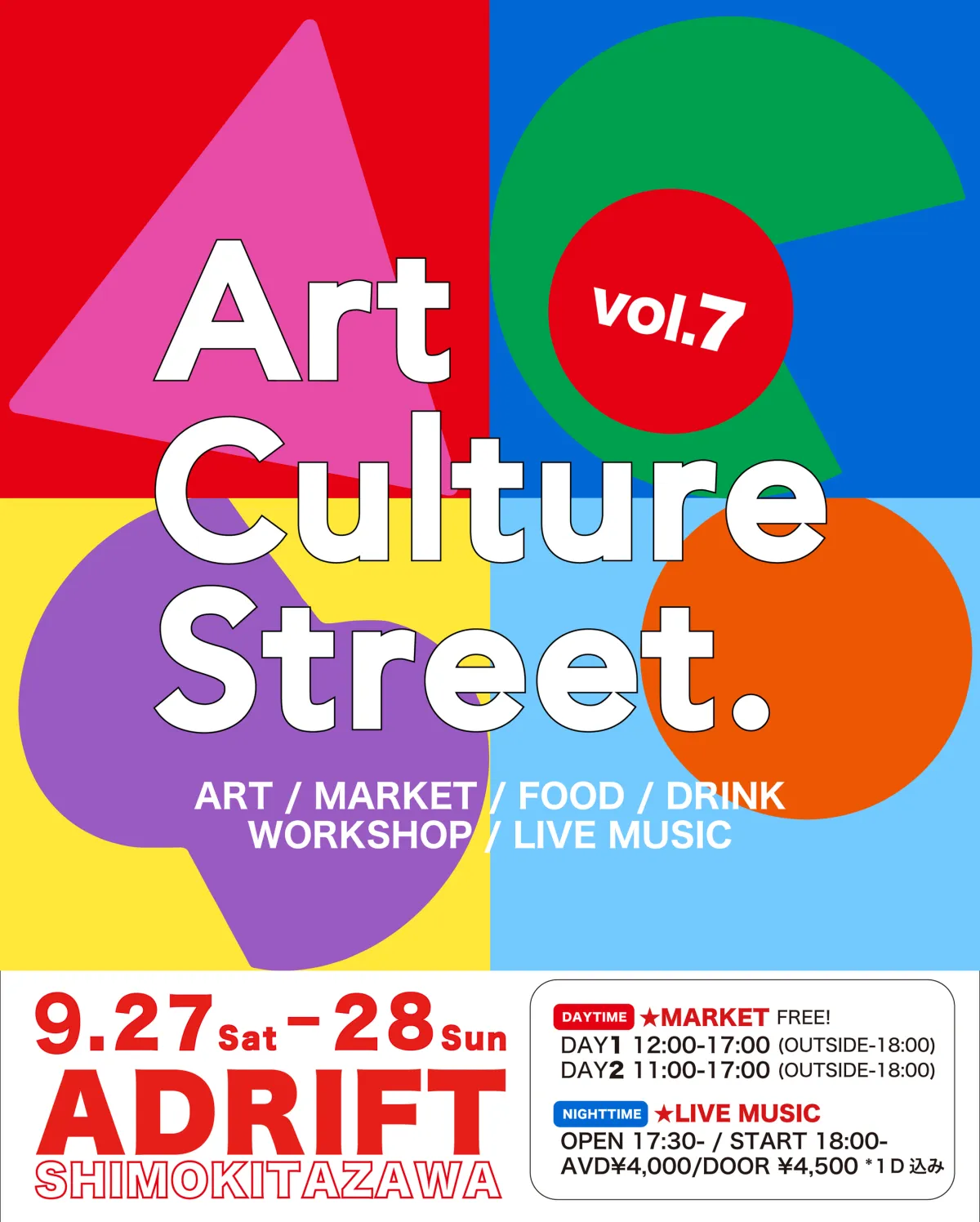 「Art Culture Street. Vol.7」は、9月27日(土)、28日(日)に下北沢ADRIFTで開催されます。参加は入場無料のマーケット(27日:12:00-17:00、28日:11:00-17:00)から始まり、夜の音楽ライブのチケットは4,000円(前売り)からで、ドリンク付きです。この機会にぜひ、アートとカルチャーのマジックに触れてください!